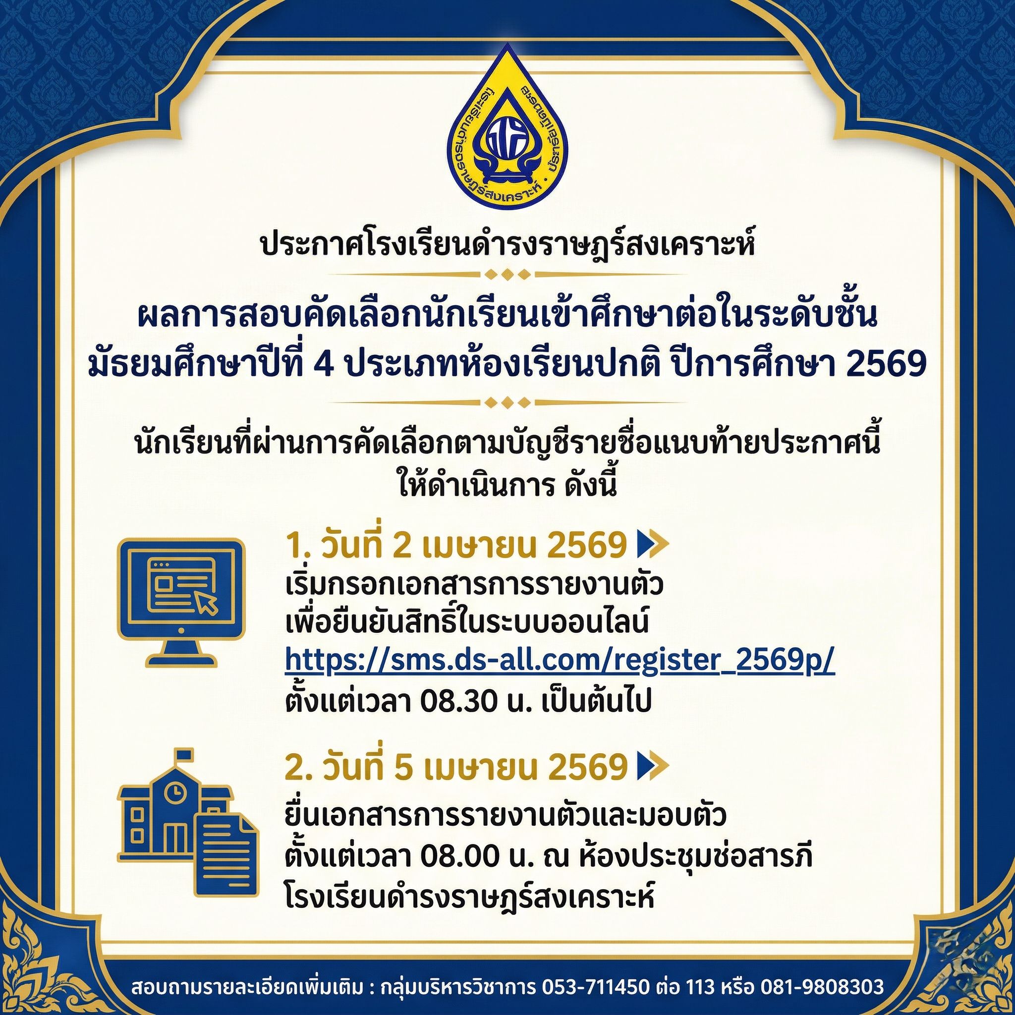 ประกาศโรงเรียนดำรงราษฎร์สงเคราะห์ จังหวัดเชียงราย เรื่อง ประกาศรายชื่อผู้มีสิทธิ์สอบคัดเลือกเข้าเรียนต่อระดับชั้นมัธยมศึกษาปีที่ 4 ประเภทห้องเรียนปกติ ประจำปีการศึกษา 2569