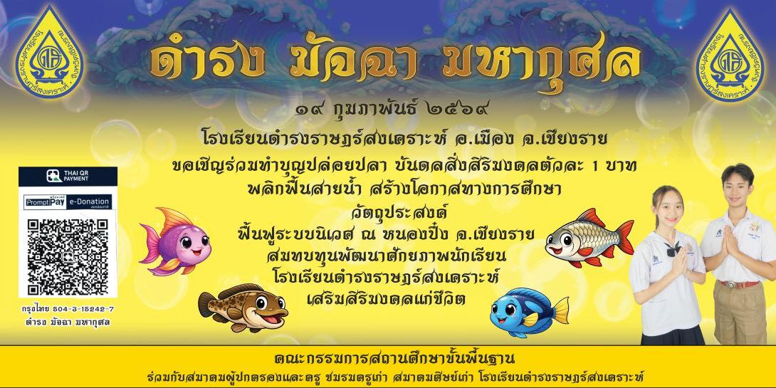 ขอเชิญชวนทุกท่านมาร่วมสร้างบุญใหญ่ พลิกฟื้นสายน้ำ และสร้างโอกาสทางการศึกษาให้แก่นักเรียน ในกิจกรรมปล่อยปลาเพื่อความเป็นสิริมงคล ![]()