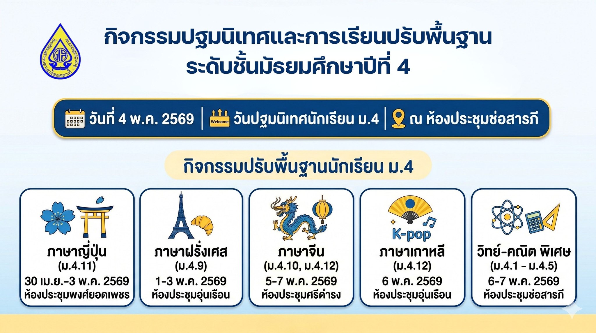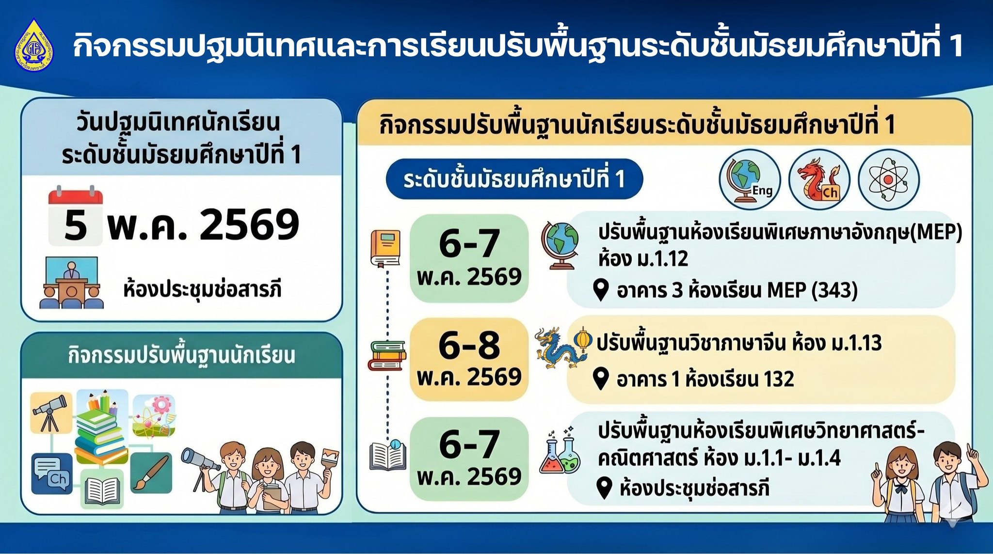 ประกาศแจ้ง กิจกรรมปฐมนิเทศและการเรียนปรับพื้นฐานของนักเรียนระดับชั้นมัธยมศีกษาปีที่1 และ ระดับชั้นมัธยมศึกษาปีที่4 ห้องเรียนพิเศษวิทยาศาสตร์-คณิตศาสตร์, ห้องเรียนพิเศษภาษาอังกฤษ MEP และห้องเรียนสายการเรียนภาษาต่างประเทศที่2 ปีการศึกษา 2569